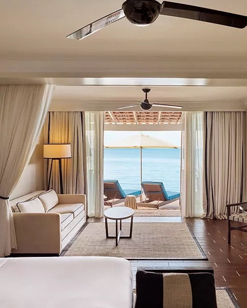 There are two restaurants: Palm Terrace, an elegant fine-dining venue with ocean views, and Taboras, a more relaxed open-air bistro by the pool and beach. For drinks, there’s also a bar serving cocktails and light fare. Wellness and leisure are central: the hotel has an outdoor freshwater pool, heated jacuzzi, and a fitness centre. Non-motorised water sports are complimentary and guests can kayak, paddle-board, sail, and snorkel at leisure and at their own schedule.