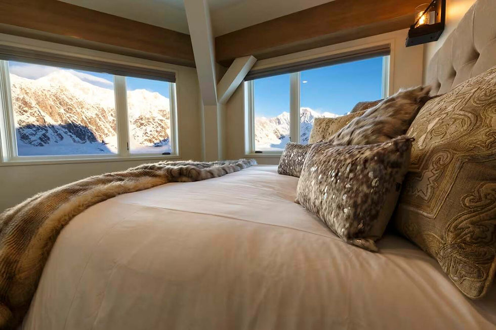 Sheldon Chalet is an ultra-luxury alpine retreat perched on a nunatak high above Denali’s Ruth Glacier, within Denali National Park in Alaska. The chalet features five custom-designed bedrooms, accommodating up to 10 guests, set in a hexagonal timber building with panoramic windows offering sweeping views of the Alaska Range.
